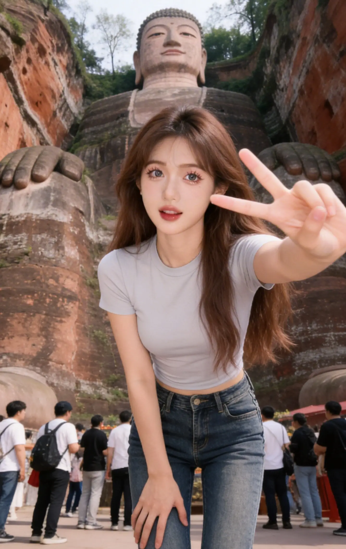 将图中游客去掉只保留中间拍着的女孩