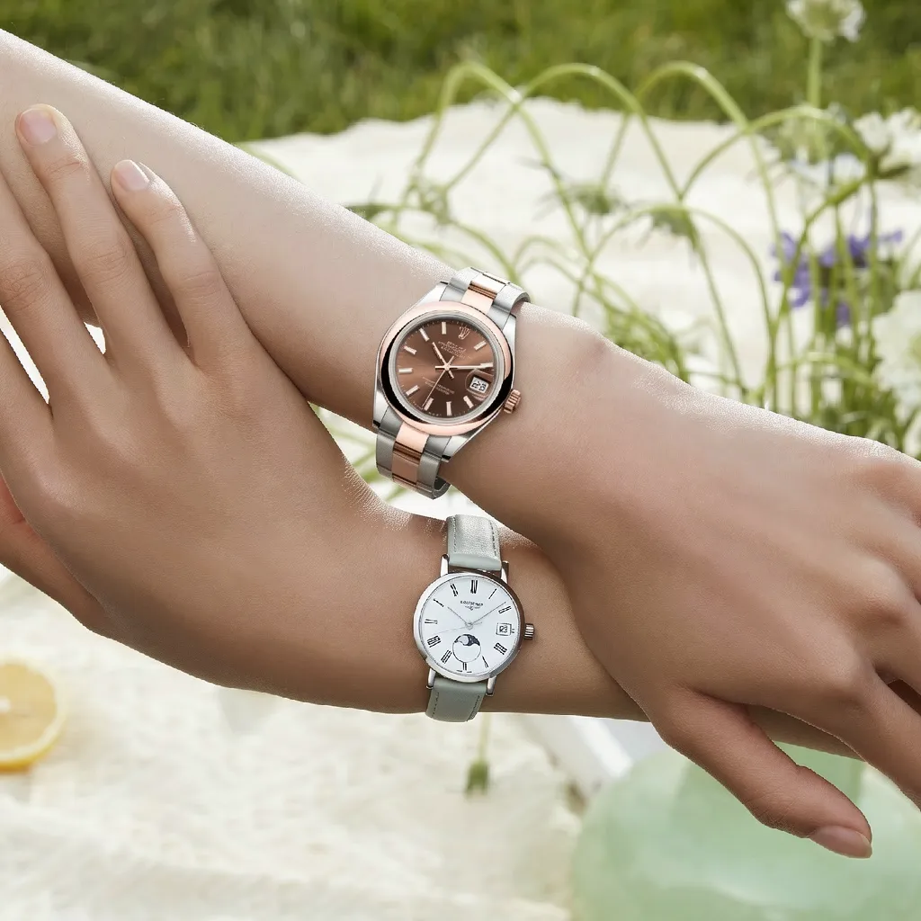 将图片中上方手臂劳力士手表多出的表链裁剪掉之后更贴合手臂。光影保持一致,手表细节保持不变。下方手表不做修改。